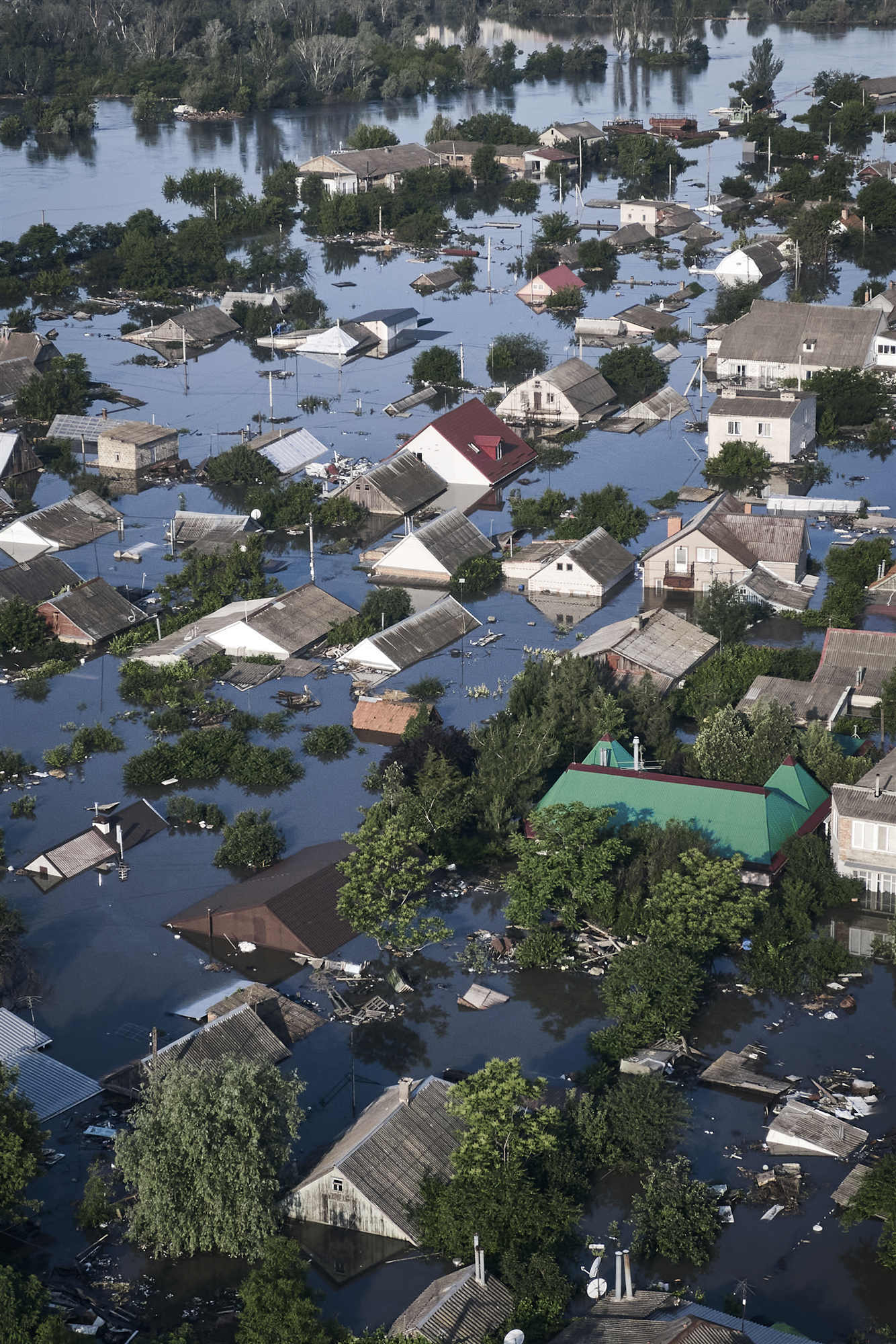 2023年6月6日,赫尔松州卡霍夫卡水电站遭袭导致水库堤坝决口,俄乌两边均指认对方发动弥留,并赐与申斥。新华社发