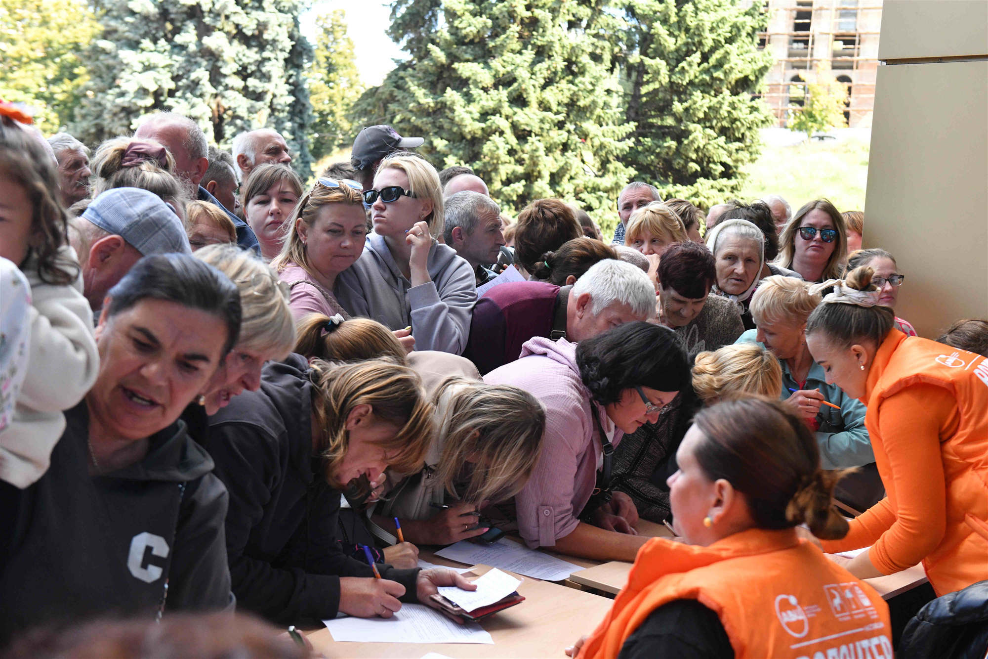 2024年8月14日,在俄罗斯库尔斯克市,来自俄乌边境地区的住户领取物质。新华社发