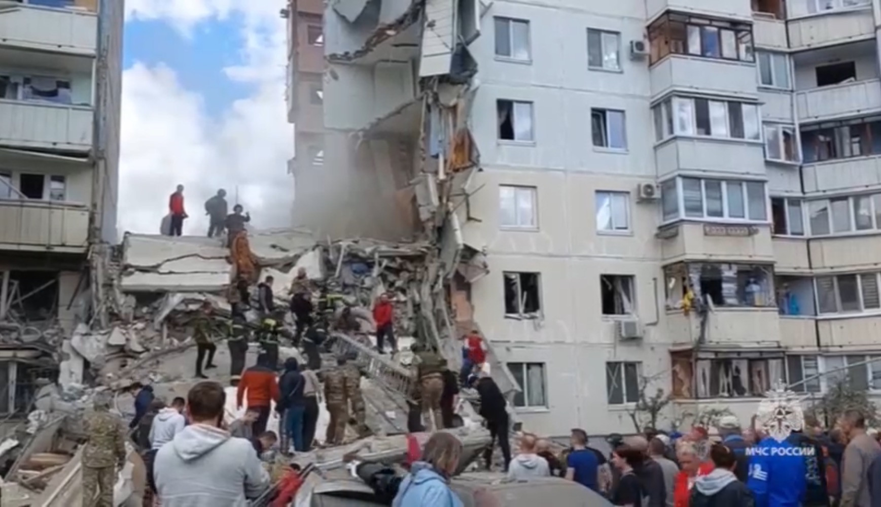 2024年5月12日,俄罗斯南部围聚乌克兰边境的别尔哥罗德市一栋住户楼遇到弥留后垮塌,图为维持东说念主员在现场使命。新华社发